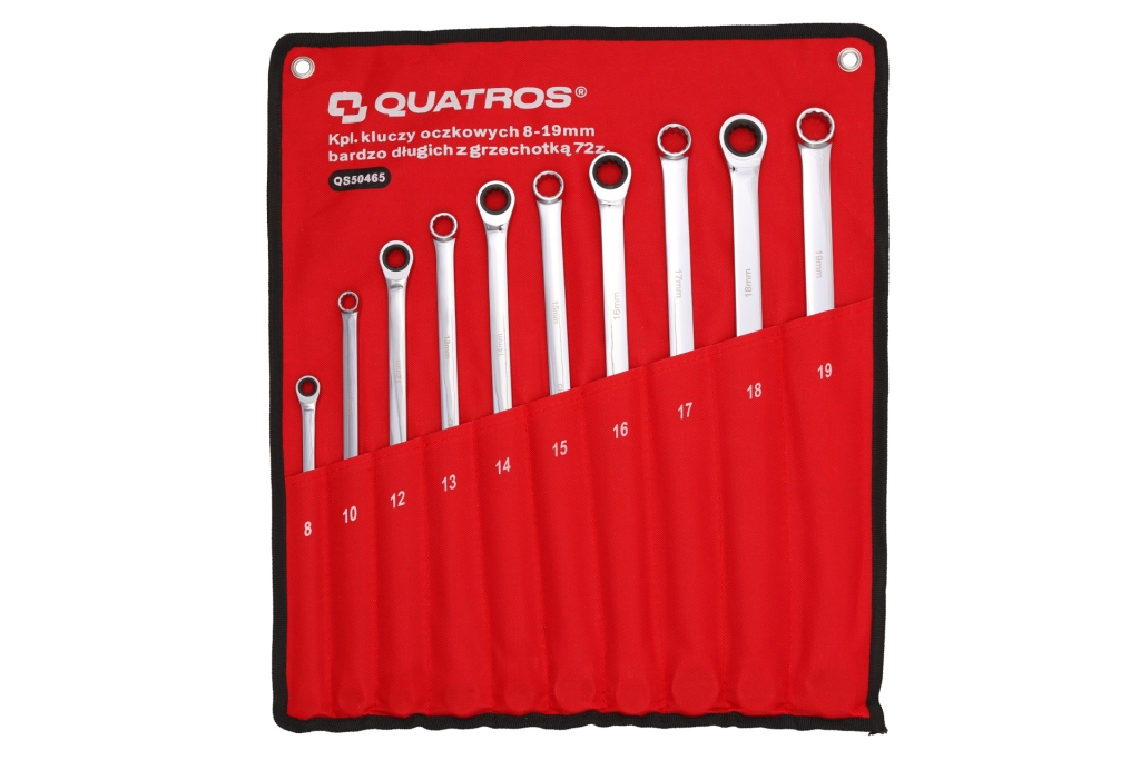10pc Extra Long Double Ring Single Gear Ratchet Spanner Set, 72-teeth, 8-19mm