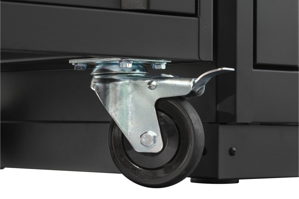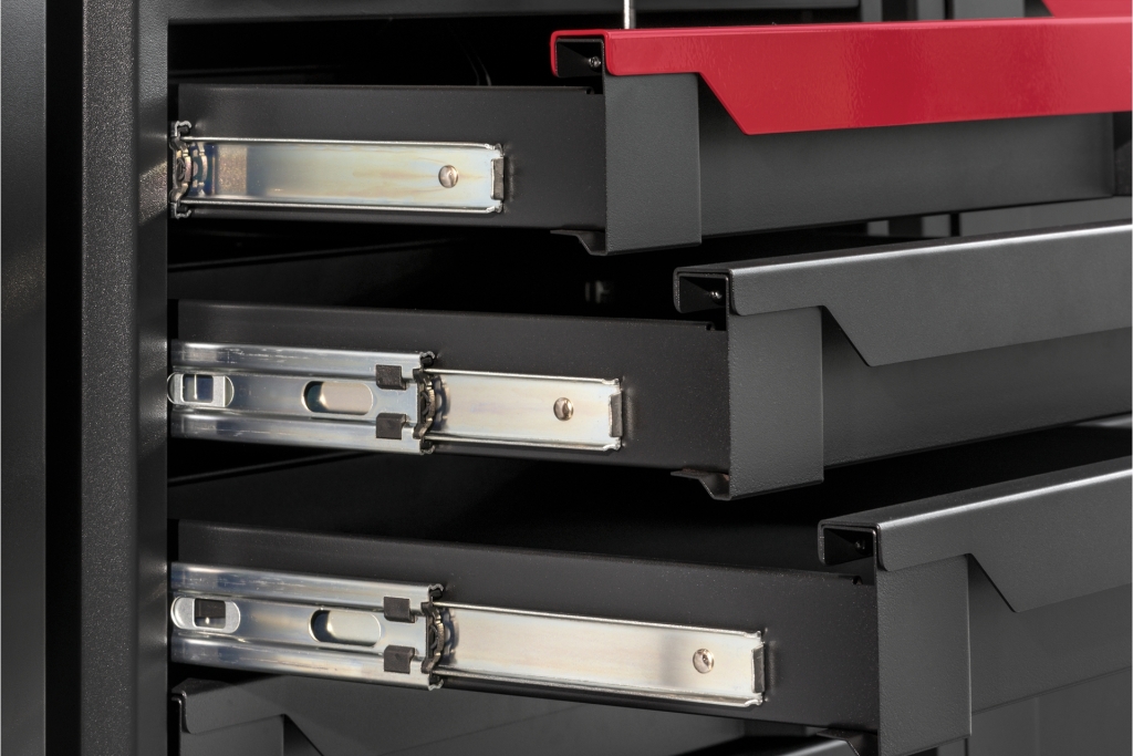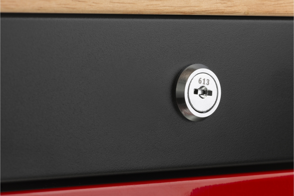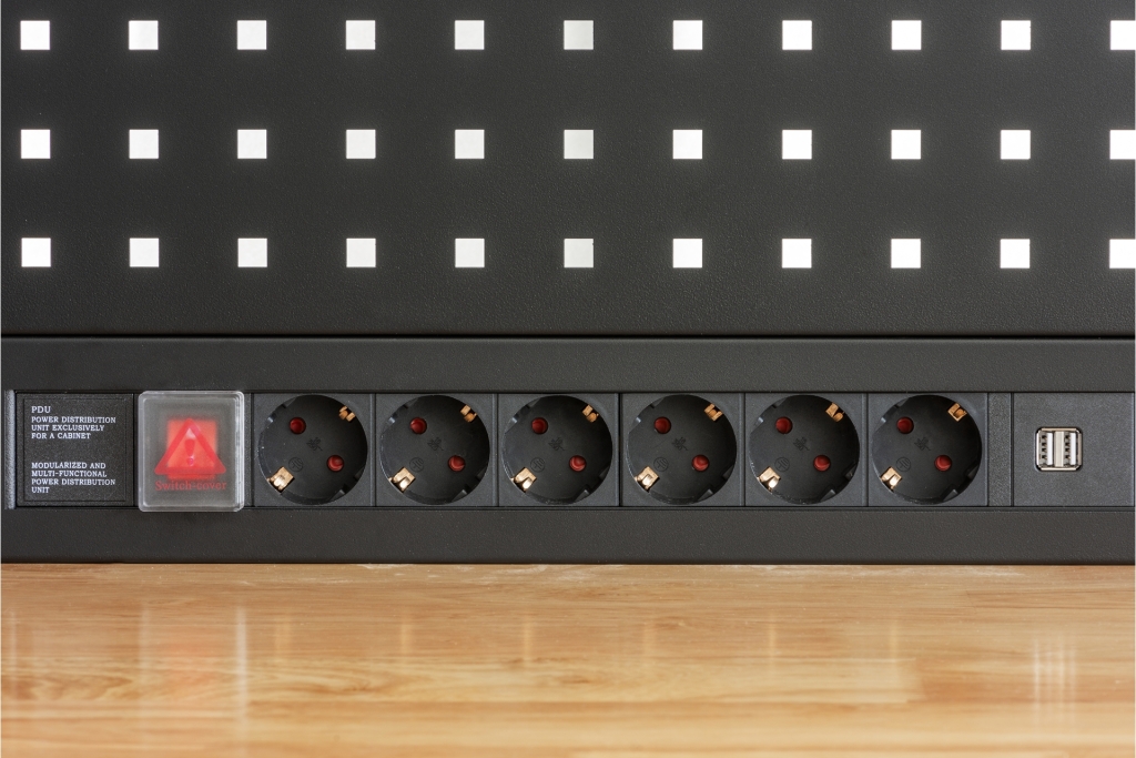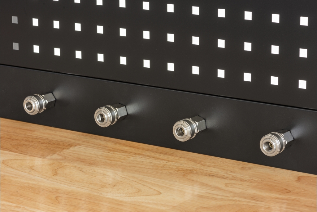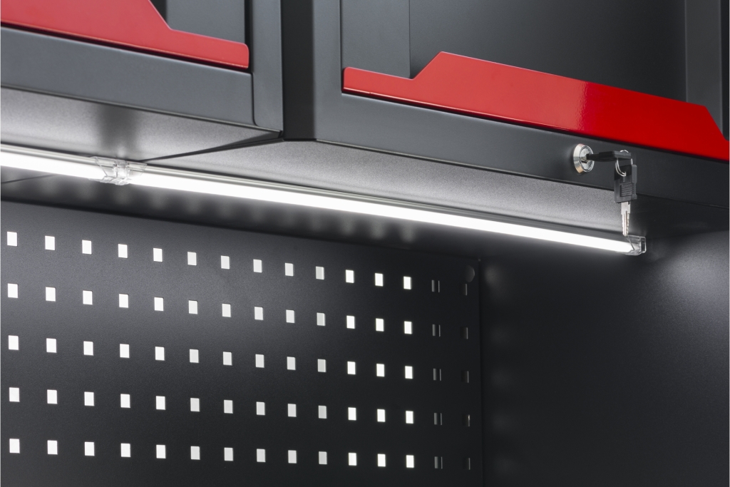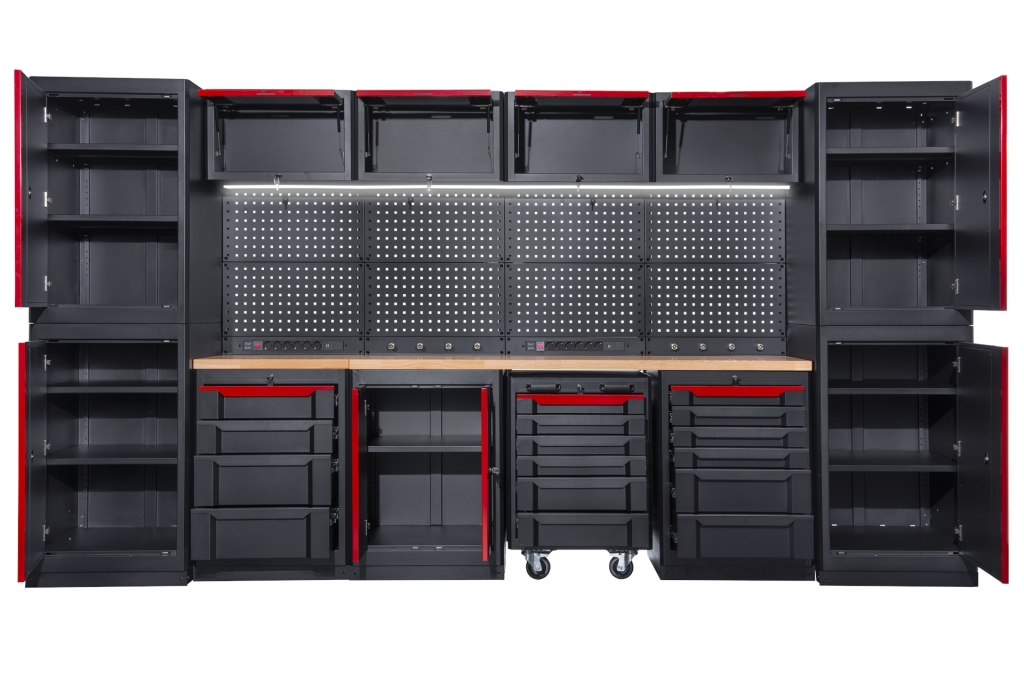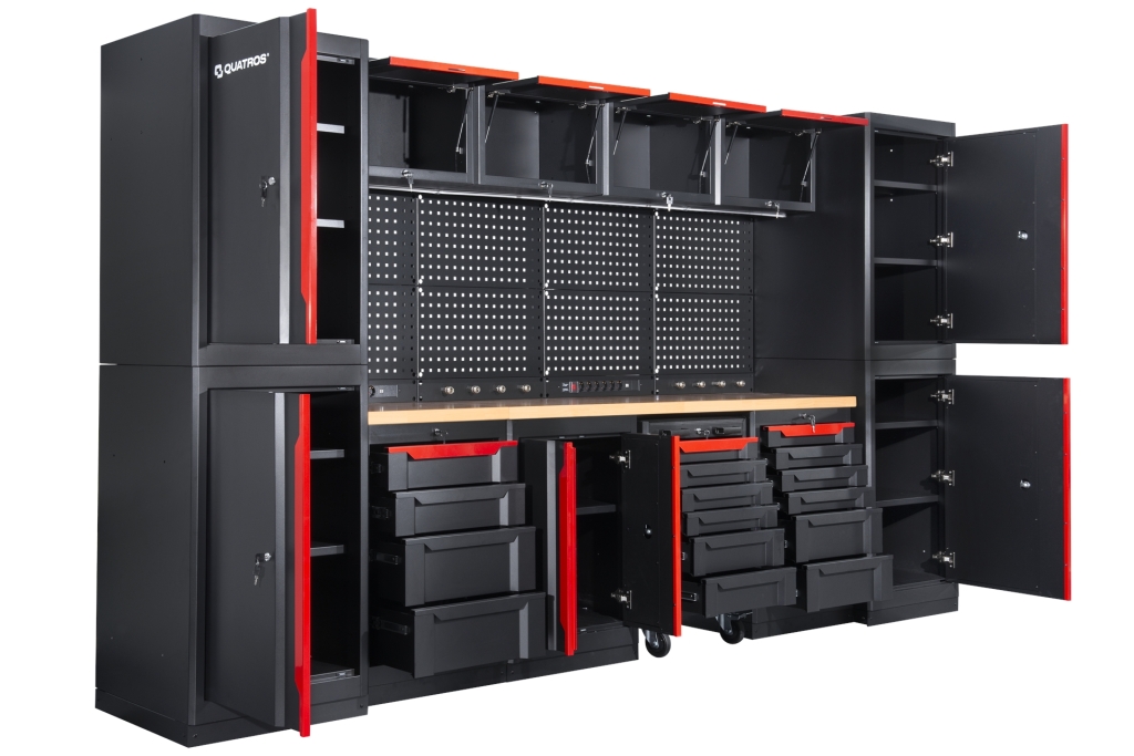 The QUATROS QS17035 Garage Storage System is a comprehensive solution for demanding users who value functionality, durability, and aesthetics in their workspace. It includes stylishly designed wall cabinets equipped with telescopic actuators, standing cabinets with soft-close systems, and a 6-drawer tool trolley with four swivel casters. The set features a functional and durable worktop with a total length of 2470mm and a thickness of 38mm, which is additionally illuminated by LED lamps. To facilitate work organization, in addition to the perforated tool board, the furniture includes power strips, which add a total of 12pcs of 230V sockets, 4pcs of USB ports (including 2pcs power switches for each power strip), and 8pcs of compressed air quick-disconnect sockets.