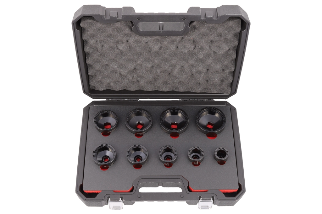 Zestaw zawiera 9 szt. nasadek z wewnętrznymi zębami przeznaczony do nakrętek łożyskowych zgodnych z DIN981.