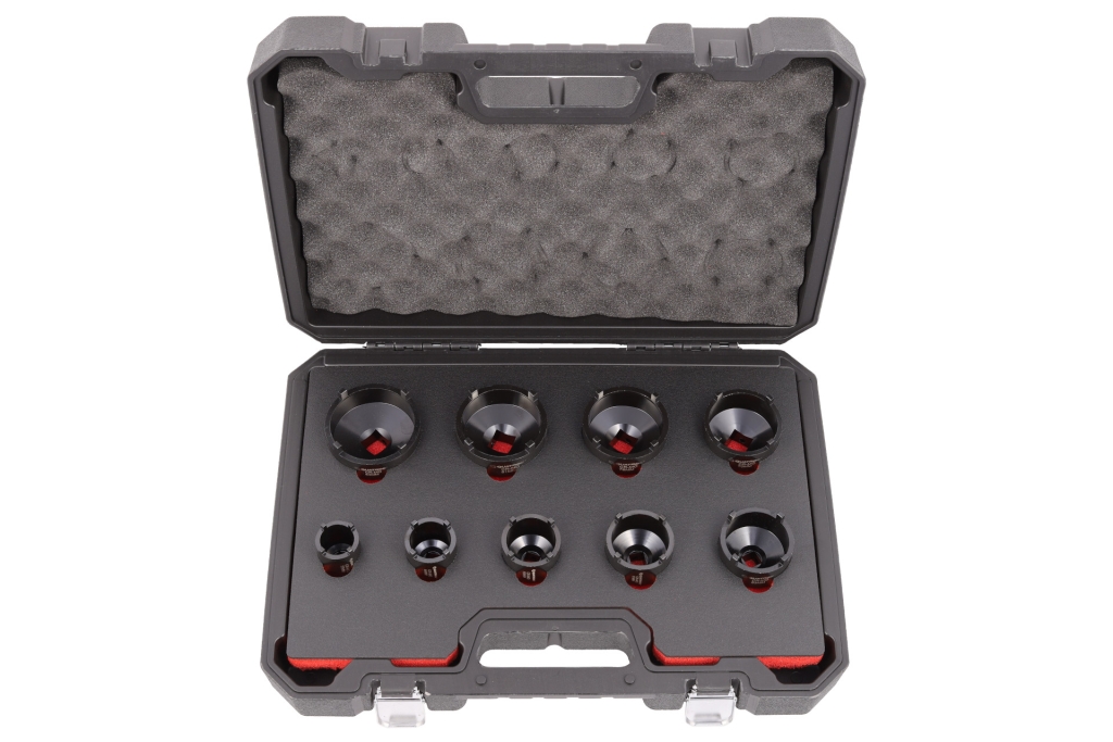 Zestaw zawiera 9 szt. nasadek z zewnętrznymi zębami przeznaczony do nakrętek łożyskowych zgodnych z DIN981.