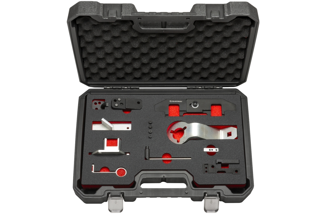 Zestaw blokad rozrządu zawierający wszystkie niezbędne narzędzia umożliwiające wymianę rozrządu bez względu na rodzaj zamontowanej pokrywy wałka rozrządu.
